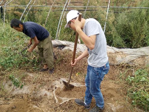 那,我们在这些志愿服务的日子里都做了什么呢?当然不是闲逛。合作社的师傅充分利用了合作社的空地,种植了各类蔬菜瓜果,面积最大的为西瓜、红薯和玉米。我在服务的这些日子里的工作,也常常是帮助师傅打理他的田地。而最大的学习,也常常发生在这些看似不高大上的工作里。在西瓜地上拔草,不是蛮力地一拔就完事了,我们还要关照一下西瓜秧的感受,如何拔掉这些草还不伤到西瓜秧的根?如何尽量不去破坏地膜?压西瓜苗,我们也不是捡起石头或者泥块随手一压,我们要把主茎往空地上引好,再盖上中午,在引的过程中,也要顺着茎本身的力,使之不至于折断。挖红薯,可不能一耙子直接下去,红薯可非要断成两截不可,我们要用耙子去撬动红薯周边的土块,从而保护好红薯。
